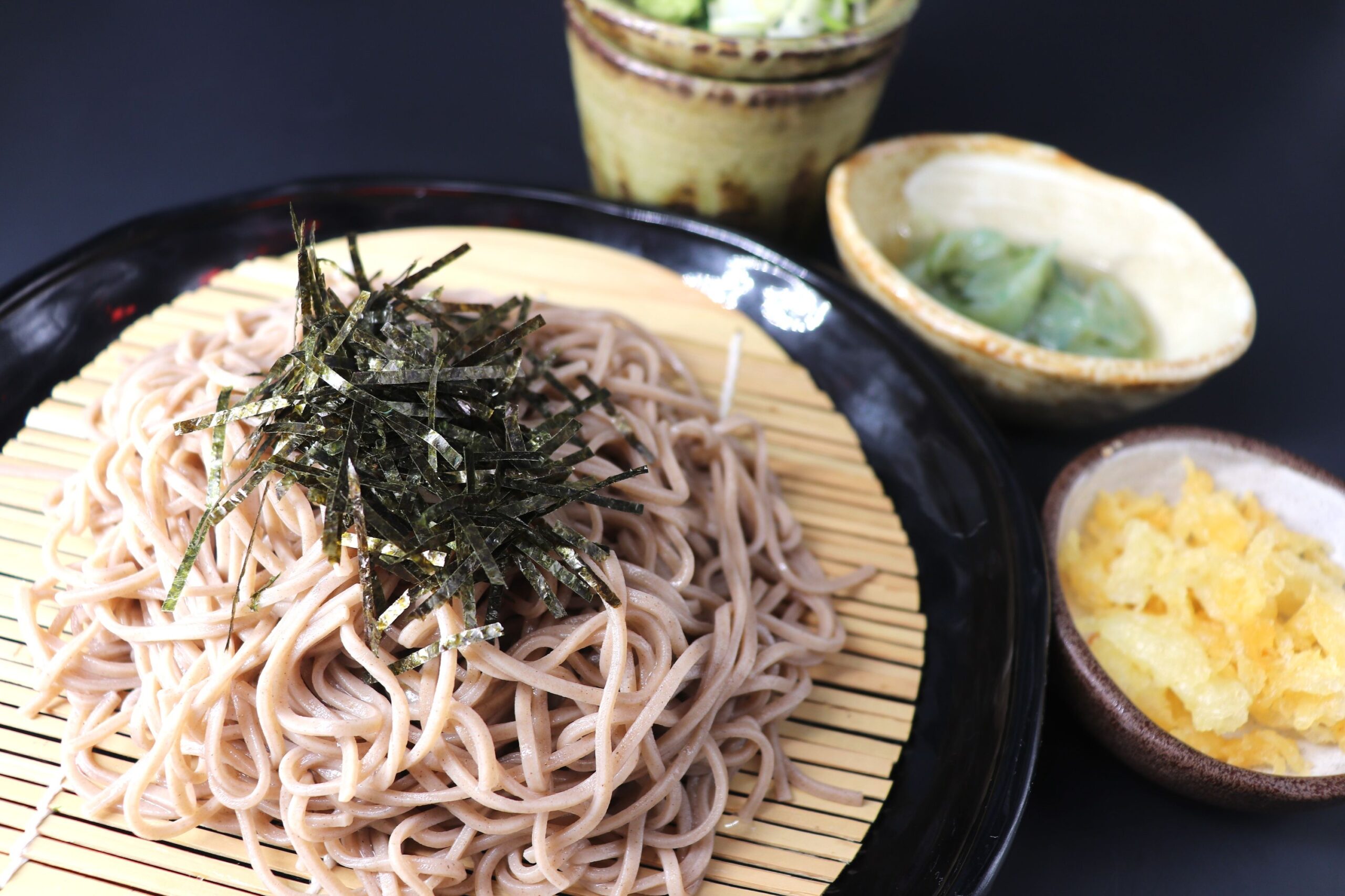 定番のざるそばです。薬味や天かすを加えてお好みでお召し上がりください。