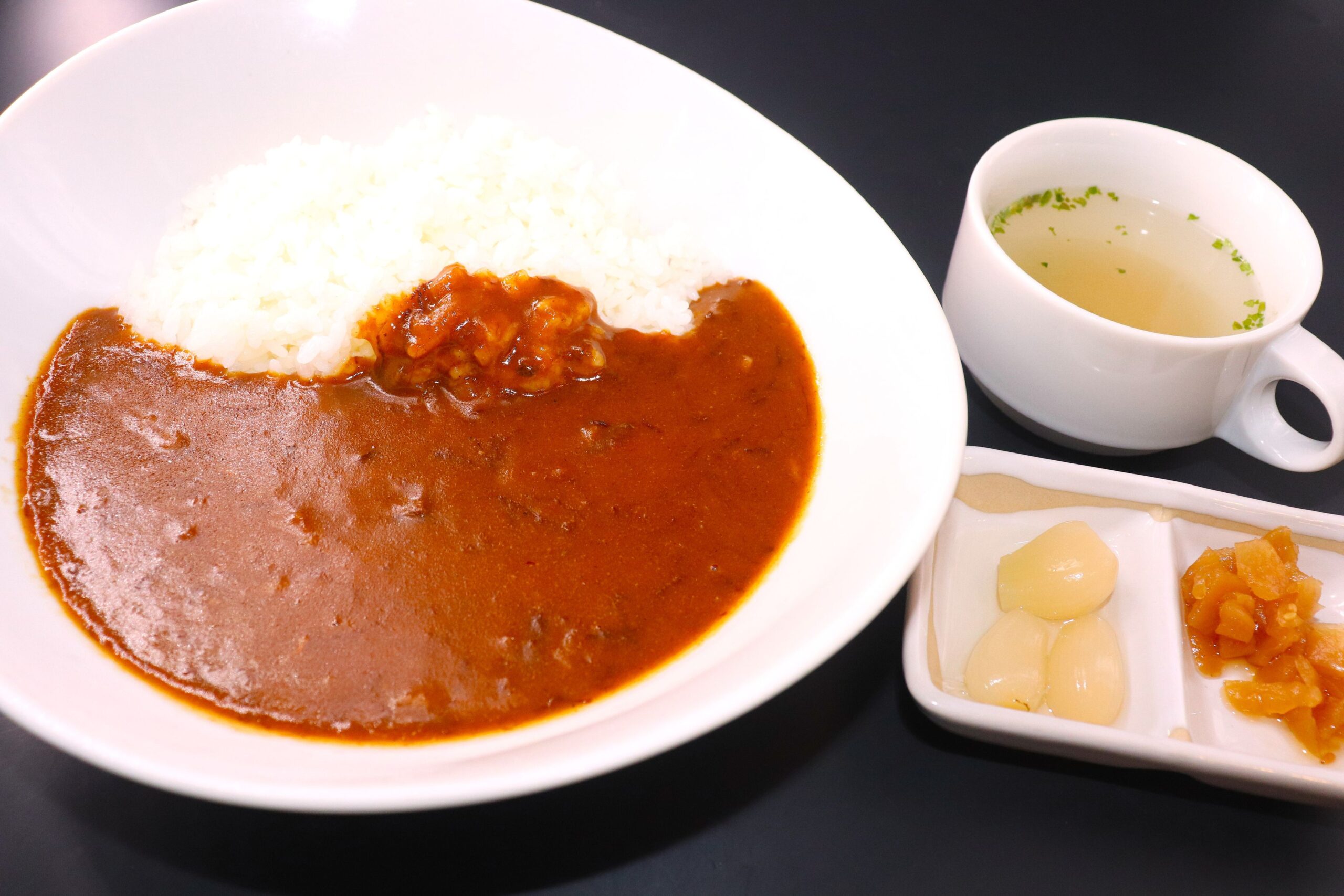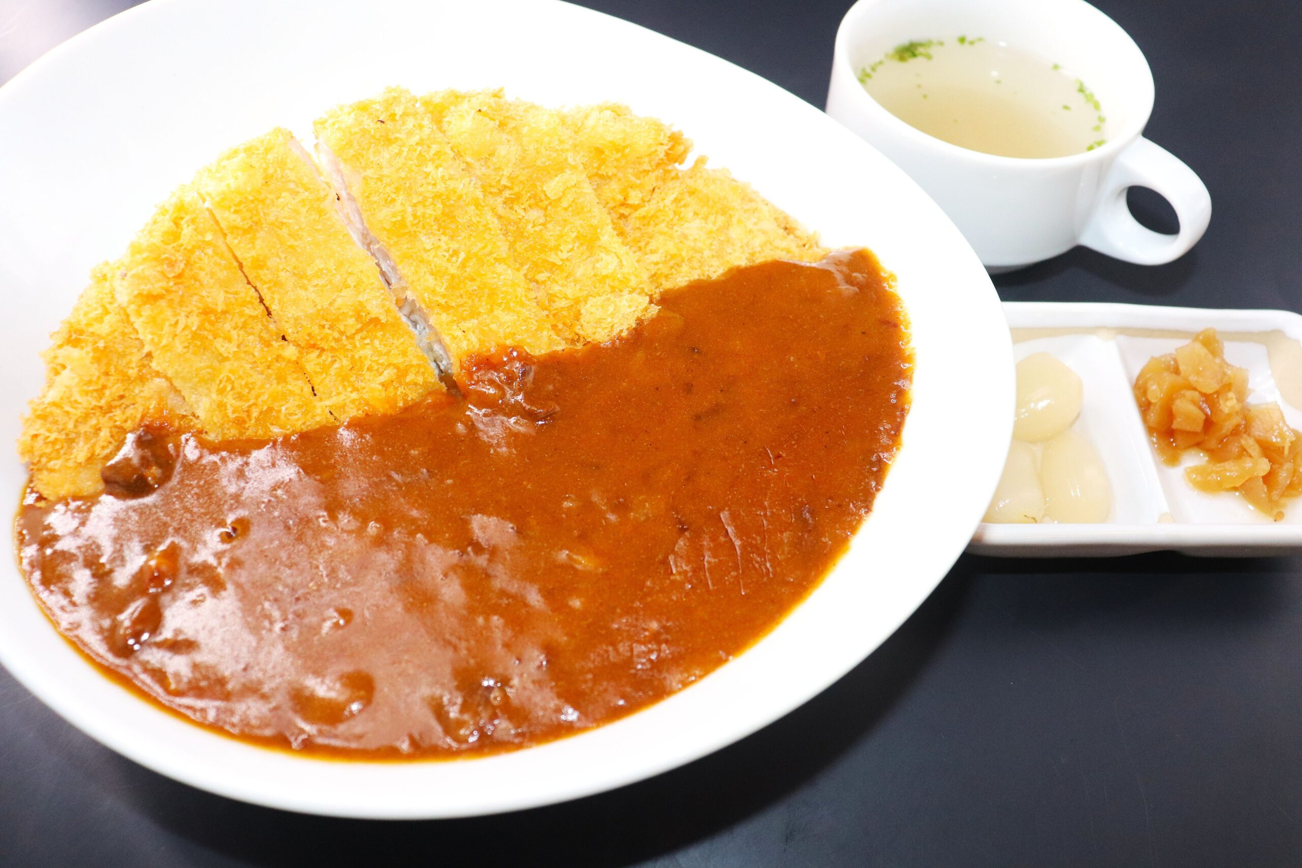 揚げたての豚ロースを乗せた食べごたえのある満腹カツカレー。