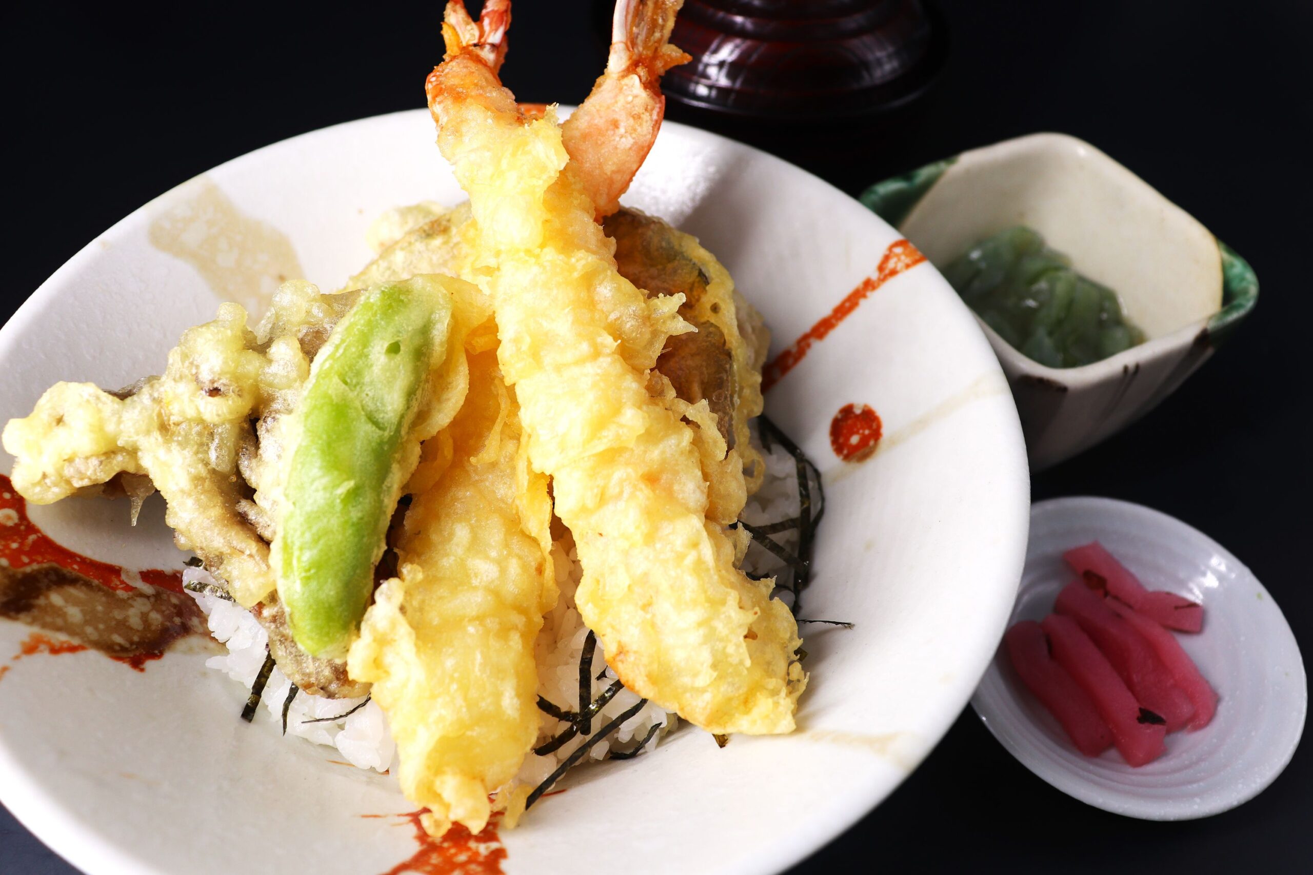 海老二本と野菜が三種のった天丼です。特製甘辛ダレが食欲をそそります。ぜひ一度ご賞味ください。
