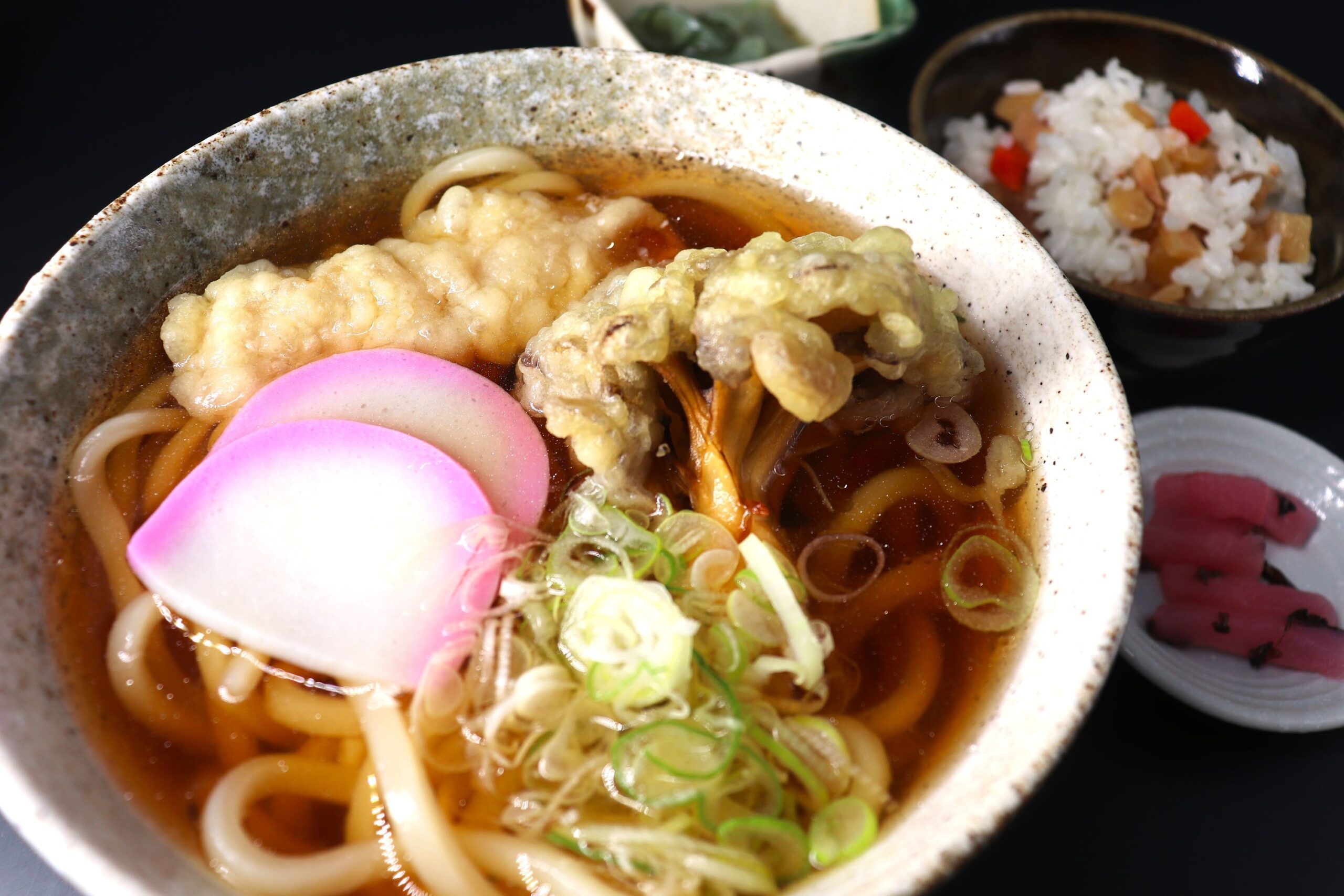 鶏天ぷらと舞茸天ぷらがのった暖かいうどんと季節の食材を使った混ぜご飯がついた名岐和定食です。ぜひ一度ご賞味下さい。