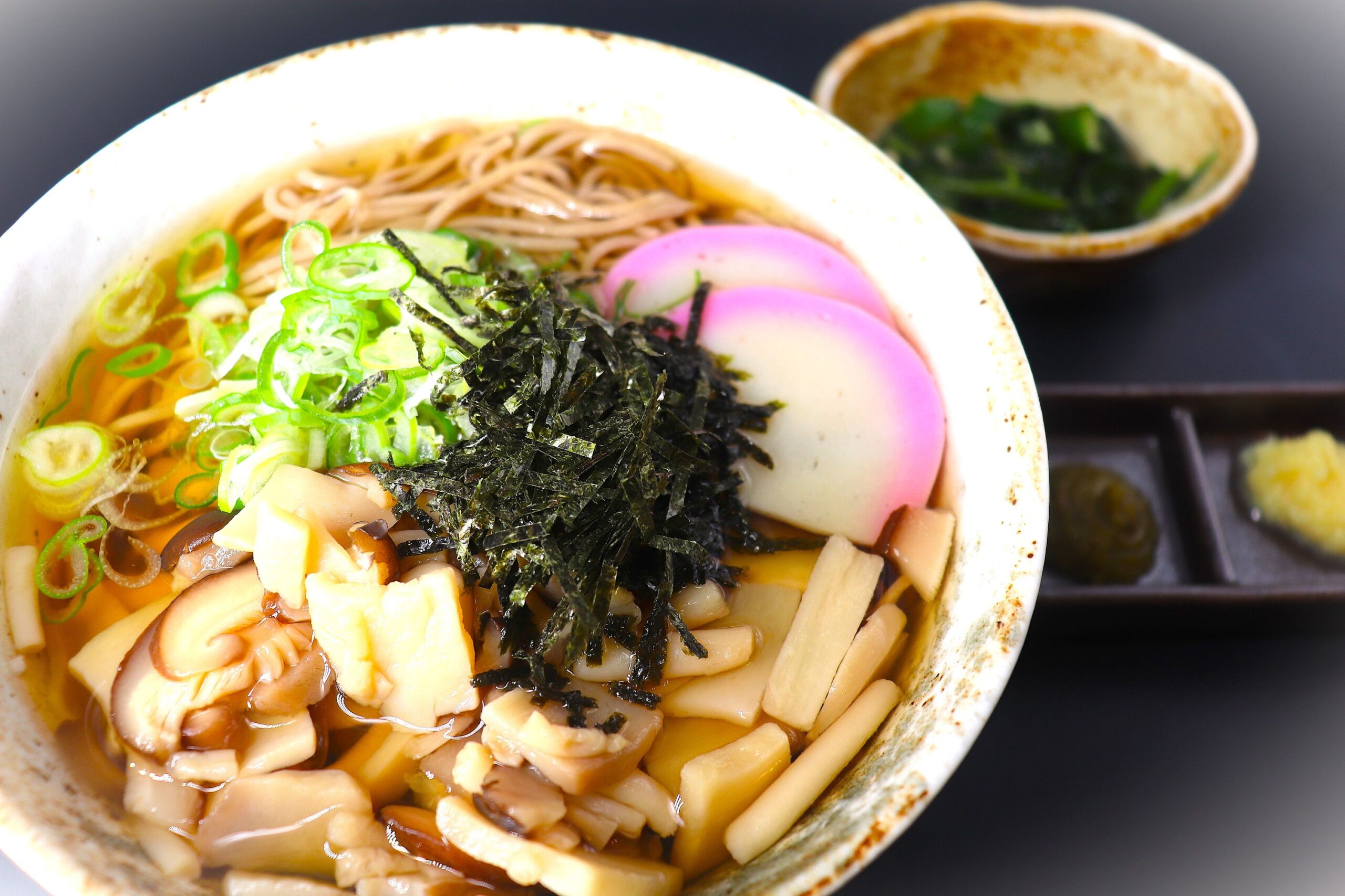 数種類のきのこをだし汁で煮て旨味を引き出したお蕎麦です。薬味を加えてお好みでお召しあがりください。