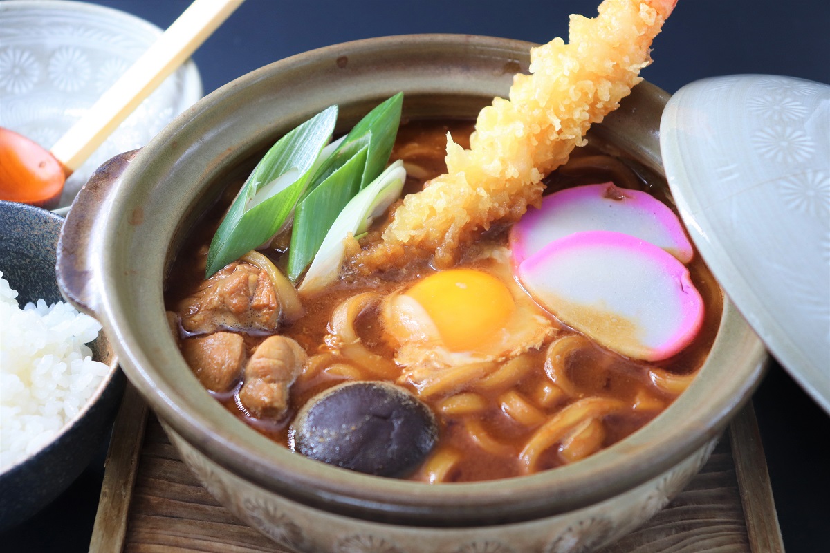 冬の温まる逸品と言えば味噌煮込みうどん。海老天ぷらと国産の鶏肉が入っています。白飯がついているのでお腹も心も満足頂けます。ぜひ一度ご賞味ください。