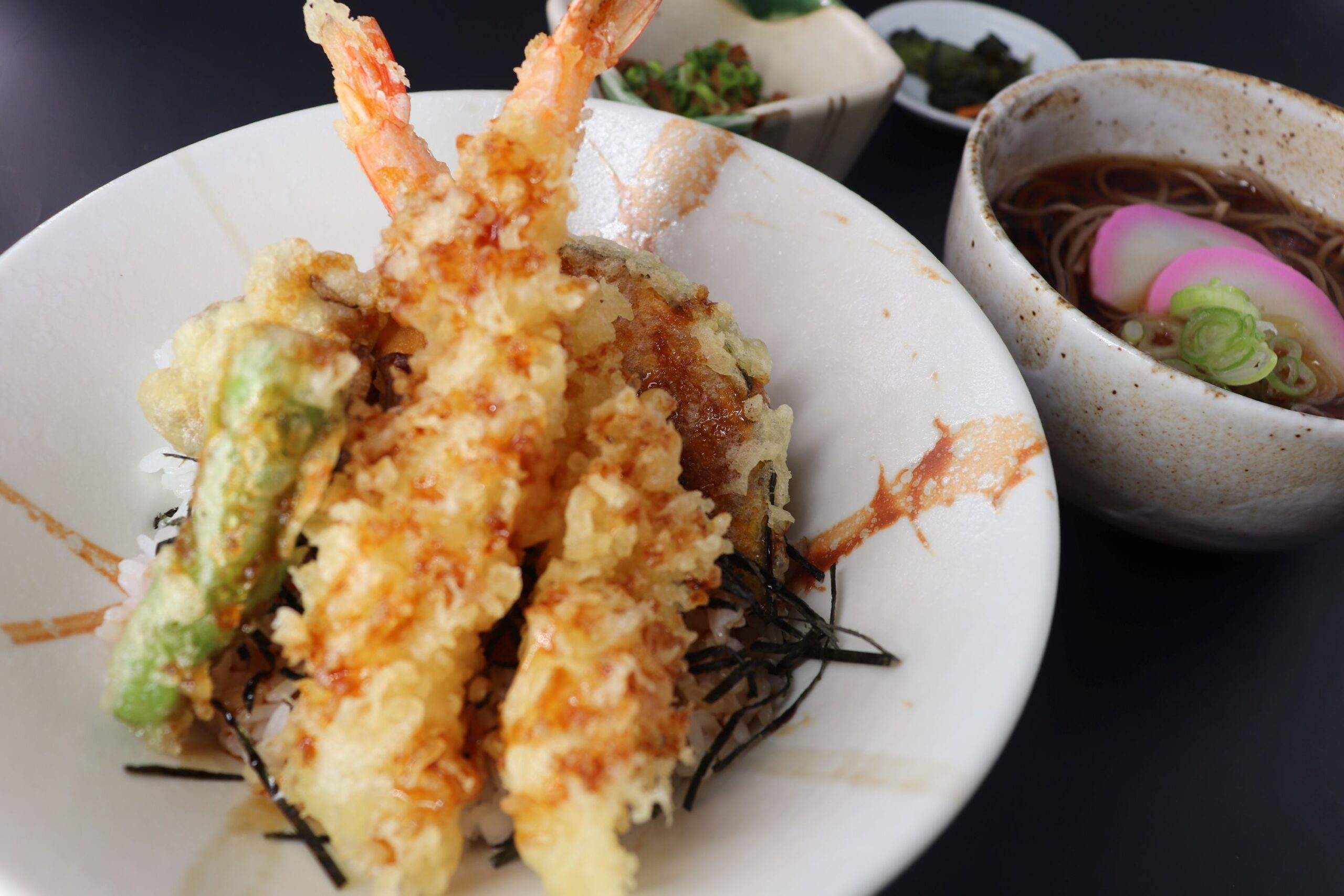 海老二本と野菜が三種のった甘辛だれが食欲をそそる天丼です。ミニそばもついたお得な一品です。ぜひ一度ご賞味ください。